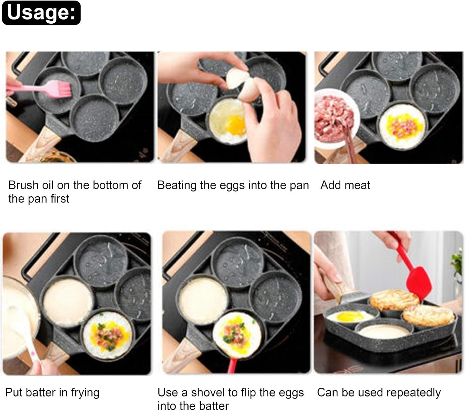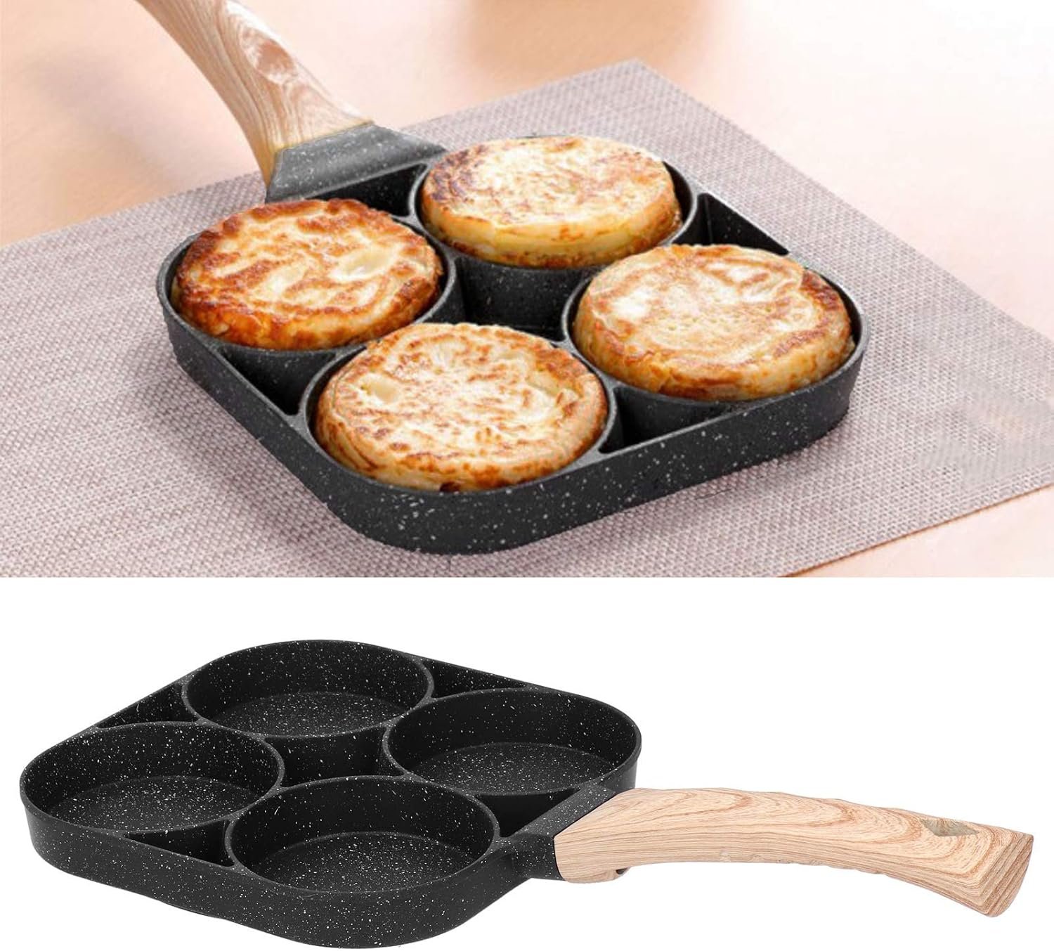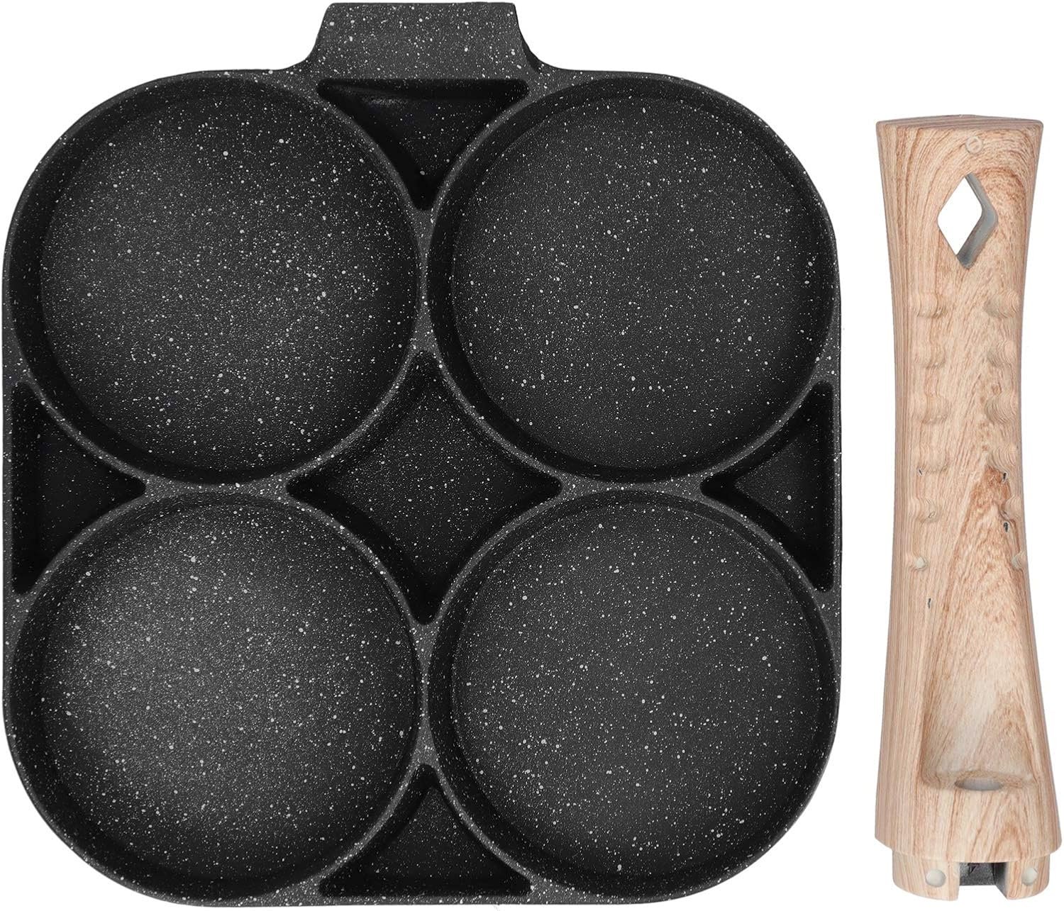 وعاء طهي بأربع فتحات، مقلاة فطائر بيض غير لاصقة بمقبض خشبي