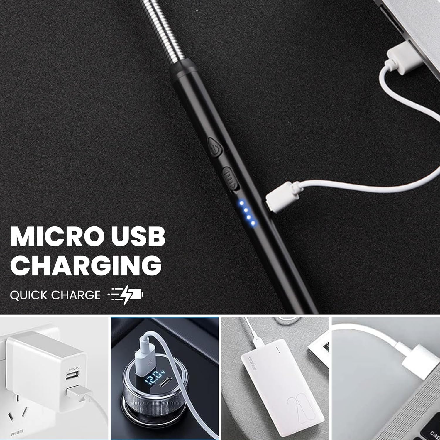 - ولاعة كهربائية: ولاعة قوس كهربائية بدون غاز وبدون لهب، يتم شحنها عبر مايكرو يو اس بي مع شاحن أو باور بانك أو كمبيوتر. (كابل يو اس بي متضمن)