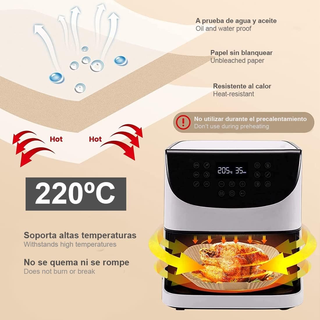 - بطانات قلاية هوائية بورق خاص: حافة بارتفاع 4.5 سم تحجز الدهون وبقايا الطعام. سهلة الاستخدام والتخلص منها، مما يطيل عمر قلايتك الهوائية. حافظ على نظافة قلايتك.