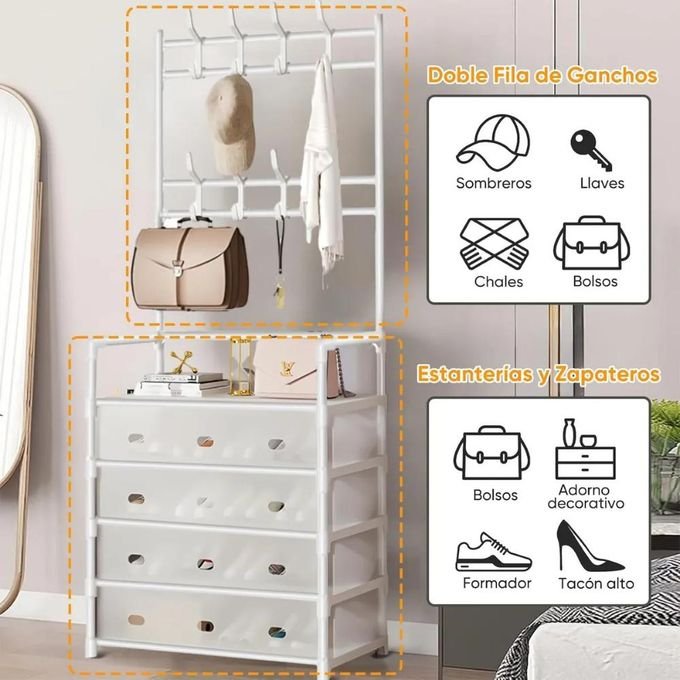 لمنتج هو خزانة أو وحدة تخزين للأحذية تتكوَّن من 5 رفوف (أو مستويات) تُستخدم لوضع الأحذية، بالإضافة إلى 8 خطّافات أو شماعات لتعليق المعاطف، القبعات، الحقائب، إلخ. غالبًا ما يكون هيكل المعدن لزيادة المتانة، وربما بعض أجزاء من بلاستيكية للرفوف